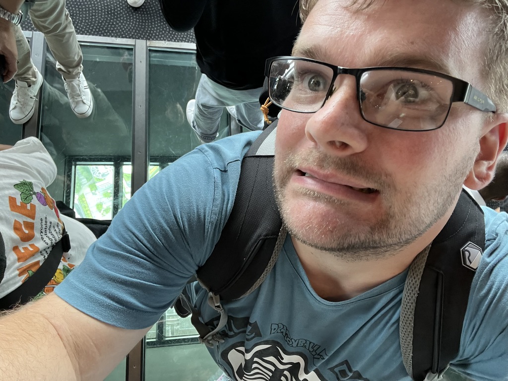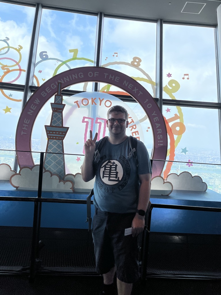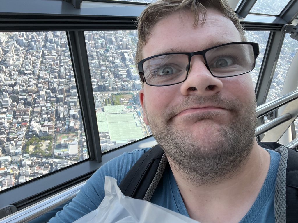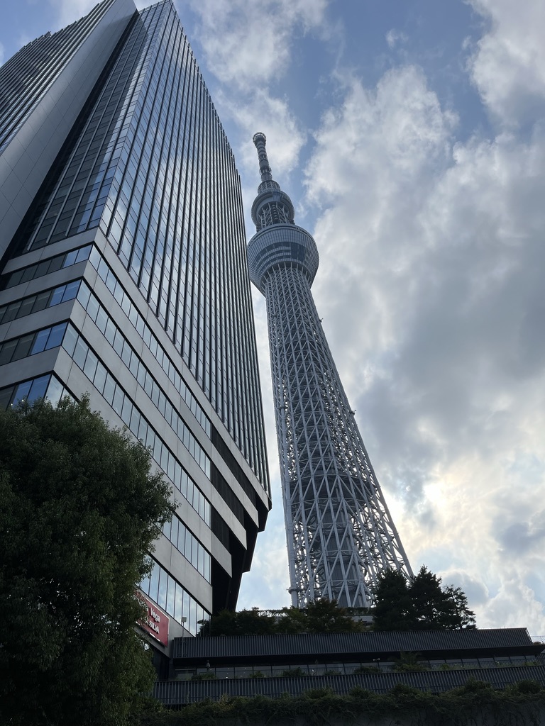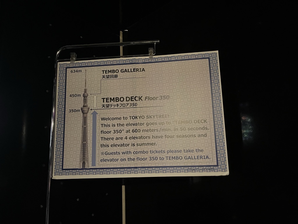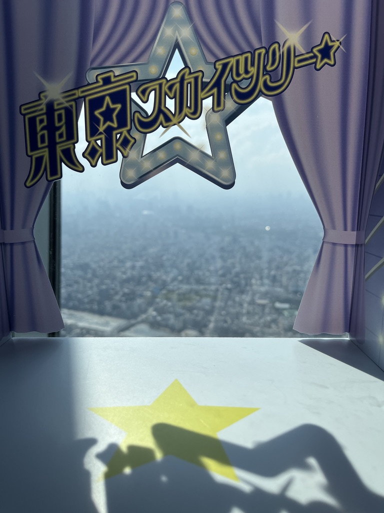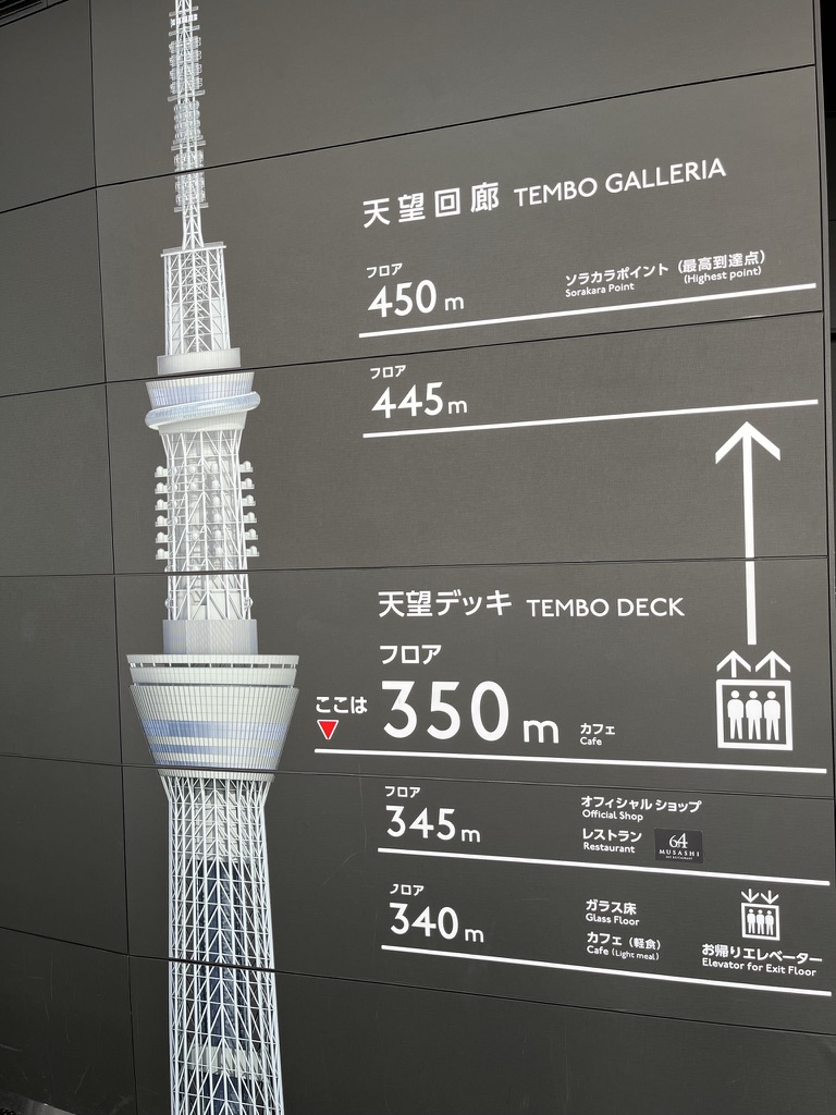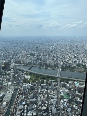 After going here, I headed on the Asakusa line to the very end where the Tokyo Skytree is. The Tokyo Skytree is a 600-meter-high radio broadcasting tower, that is also a tourist attraction. I got a ticket to go up it and from the 4th floor to 350 meters up it only took 50 seconds which is insane. There are two sections in the sky tower, and the first one is called the Skytree Tenbo deck, and it consists of 3 floors, 2 cafes and 1 high class French restaurant, yes that is right a restaurant!