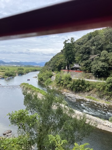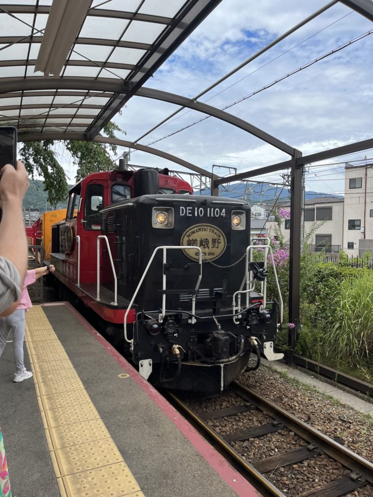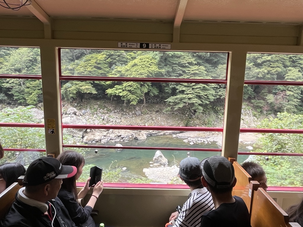It is pulled by an old diesel locomotive, well pushed for the direction we were going in down a separate line that hugs the Hozu Valley River instead of just going through the mountains like the JR line does.
