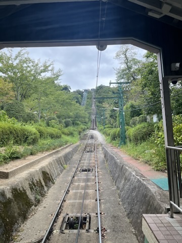 This two-rail funicular system is quite old and uses the weight of the one coming down to help pull the other up and they split in the middle and pass each other, and it only takes about 3 mins per trip.