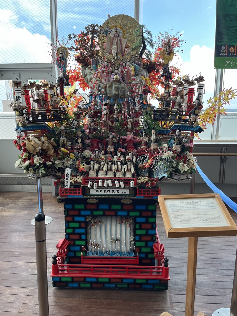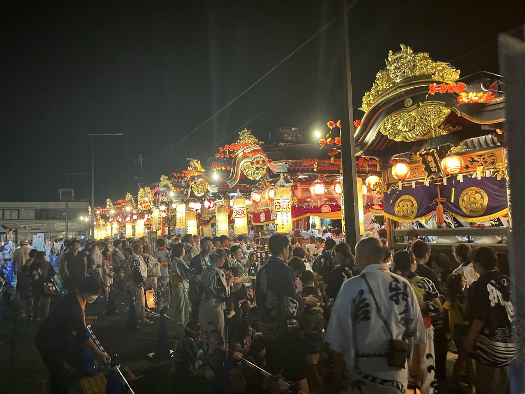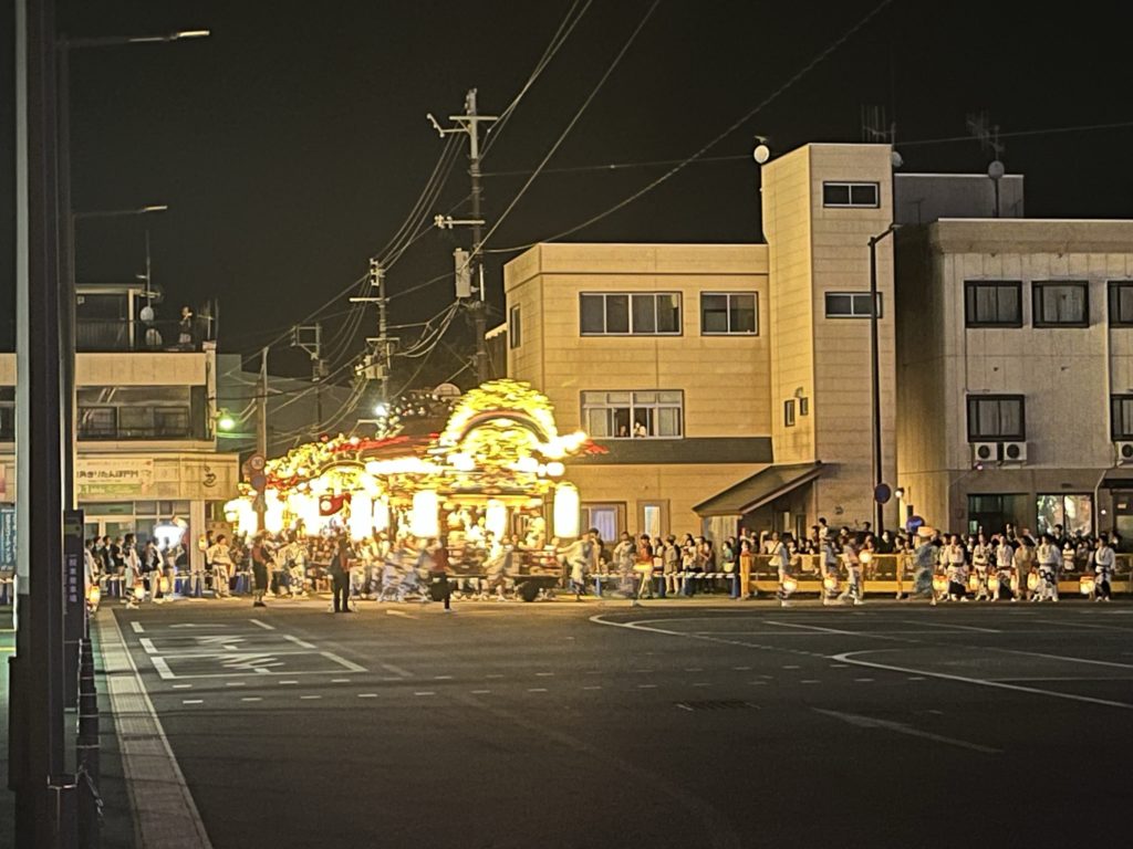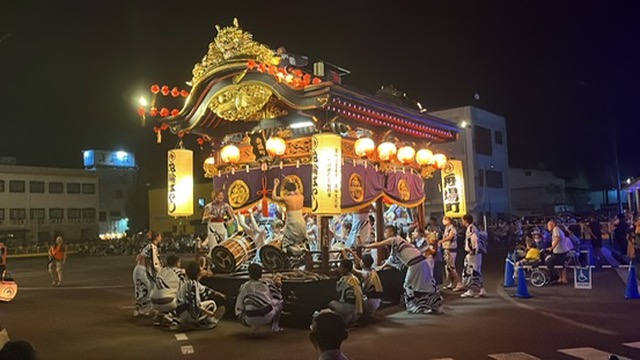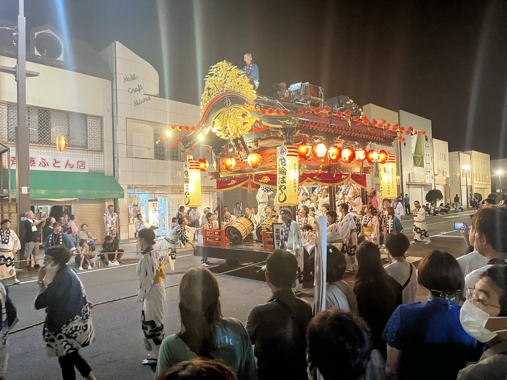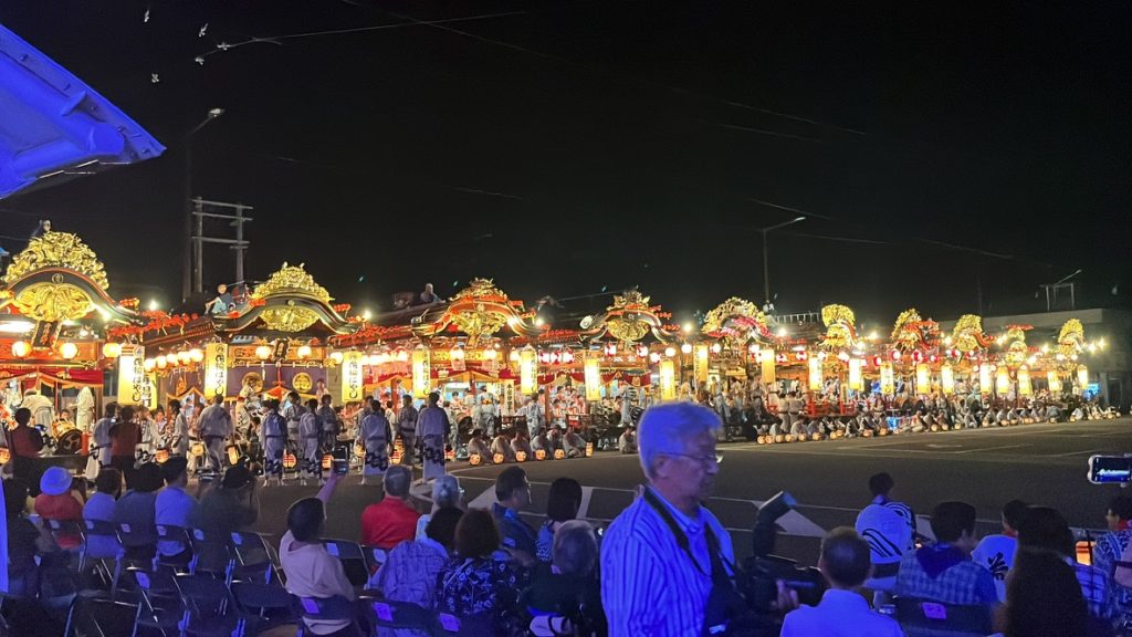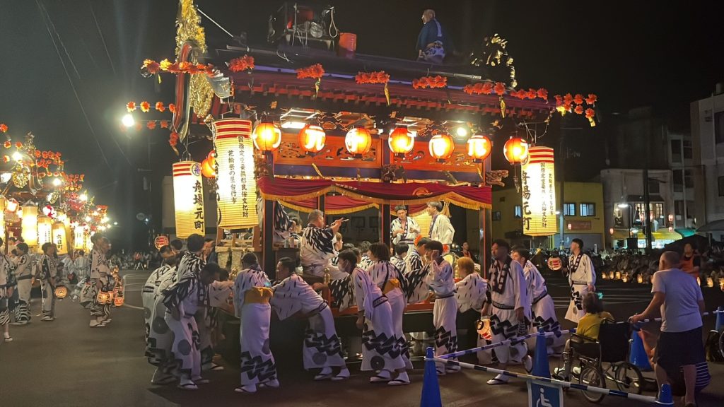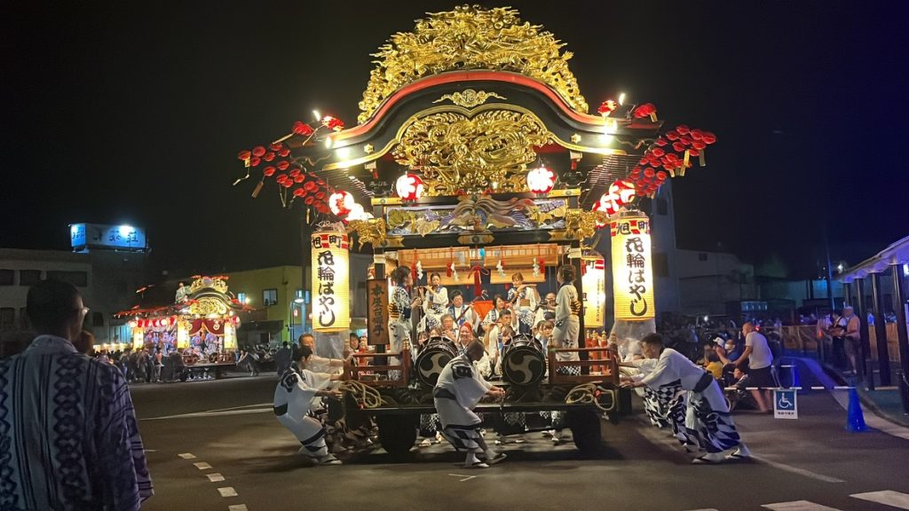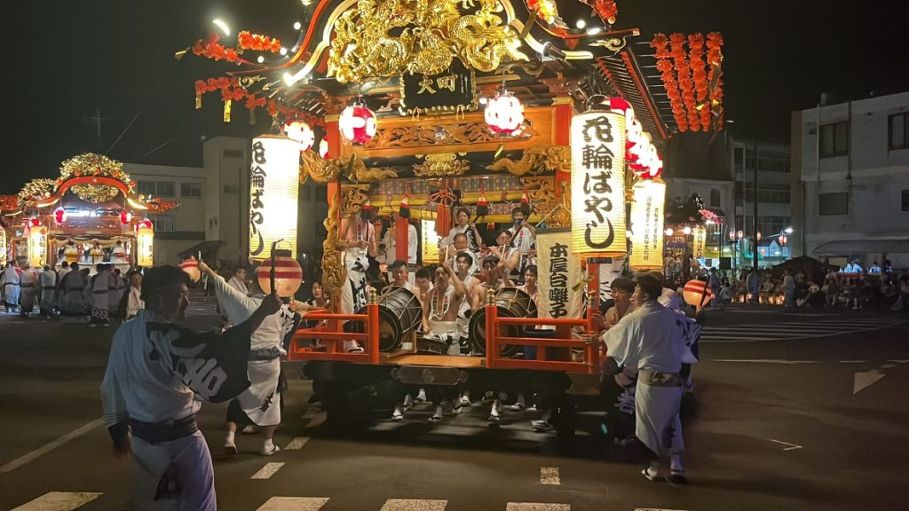 The festival is called Hanawabayashi which is a festival of light and music which takes place just after Obon. It has a history that dates back quite far to 1765. On the 16th (day after Obon) they get all the people who are considered unlucky and have a mass exorcism ceremony in front of the Shinto god of birth (which resides in a nearby shrine). A few days after this on the19th and 20th there is a big, massive float parade from 10 districts in the town offering music to the deity. It was amazing to watch, and the music was awesome.
