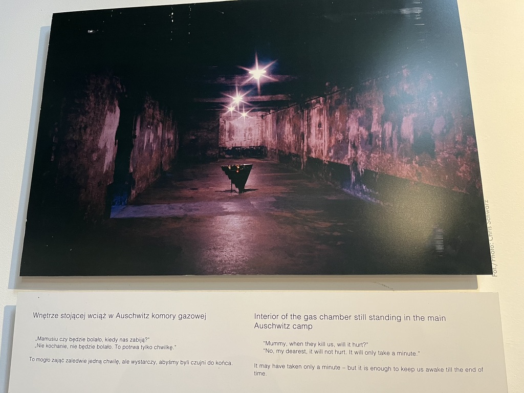One piece of photography that stunned me the most, still makes me really sad and bring a tear to my eyes, is the one of the gas chamber from the main Auschwitz camp with a quote below it saying “Mummy, when they kill us will it hurt?”, “No, my dearest, it will not hurt. It will only take a minute”.